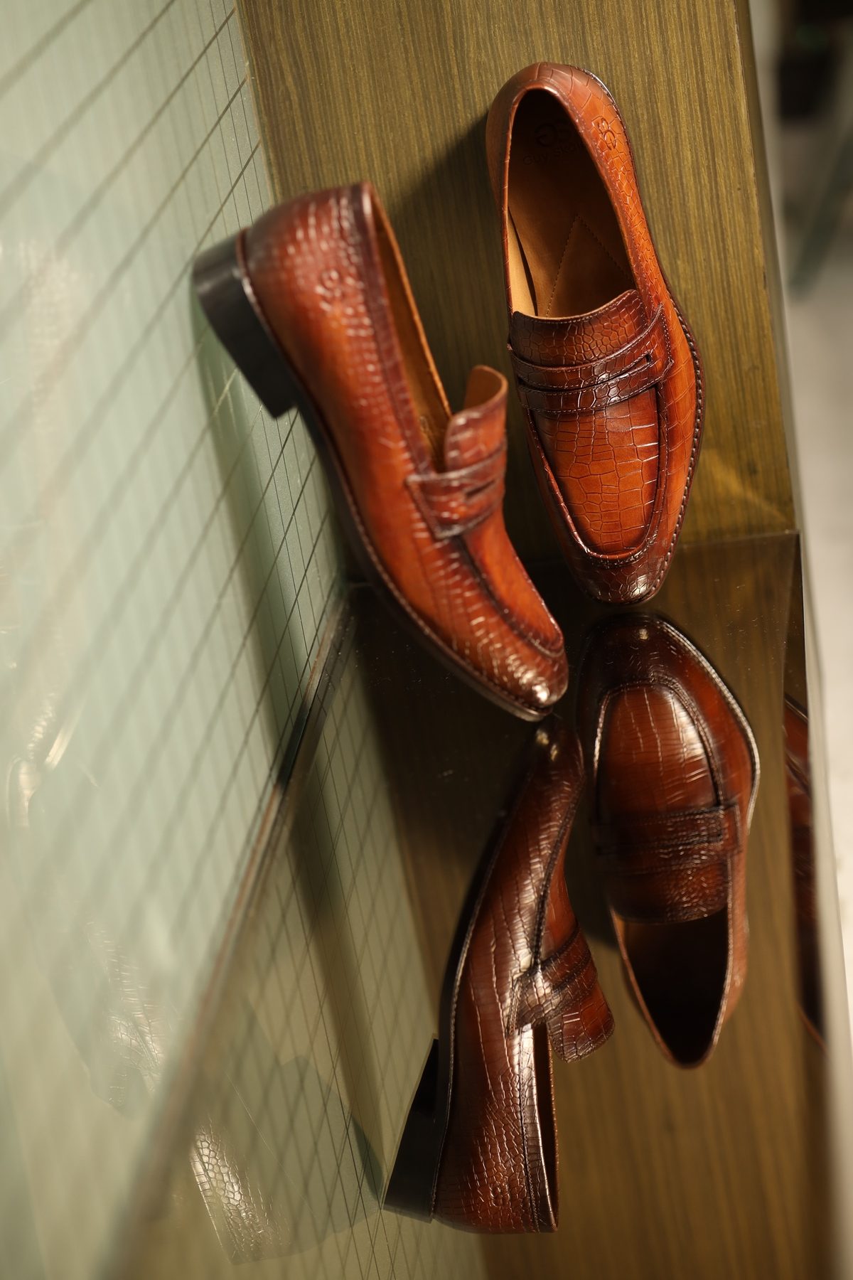 Elegant loafers with cognac-leather lining by BOSS. Expertly crafted with gorgeous aniline dyed color blend of rich browns and embossed as croco skin.These loafers are shaped in smooth finish with an apron toe and penyy loafer saddle at the vamp. A argeentinian leatrher outsole completes this modern pair. This dress shoe adds to an evening wear suite .